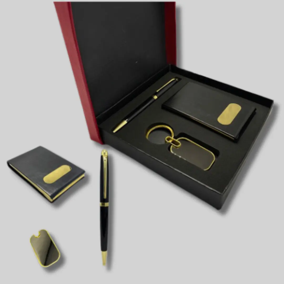 Introducing the ultimate convenience and style in the form of 3 in 1 Gift Sets. These versatile sets are designed to meet all your daily needs with elegance and functionality. Featuring a sleek keychain to keep your keys secure, a sophisticated pen for jotting down notes, a practical key holder for organization, a chic card case for easy access to your essentials, and a sleek wallet to keep your cash and cards organized. Whether for yourself or as a thoughtful gift, these sets offer unparalleled convenience and sophistication, ensuring you’re always prepared in style wherever you go.