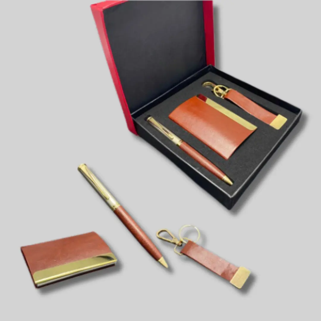 Introducing the ultimate convenience and style in the form of 3 in 1 Gift Sets. These versatile sets are designed to meet all your daily needs with elegance and functionality. Featuring a sleek keychain to keep your keys secure, a sophisticated pen for jotting down notes, a practical key holder for organization, a chic card case for easy access to your essentials, and a sleek wallet to keep your cash and cards organized. Whether for yourself or as a thoughtful gift, these sets offer unparalleled convenience and sophistication, ensuring you’re always prepared in style wherever you go.