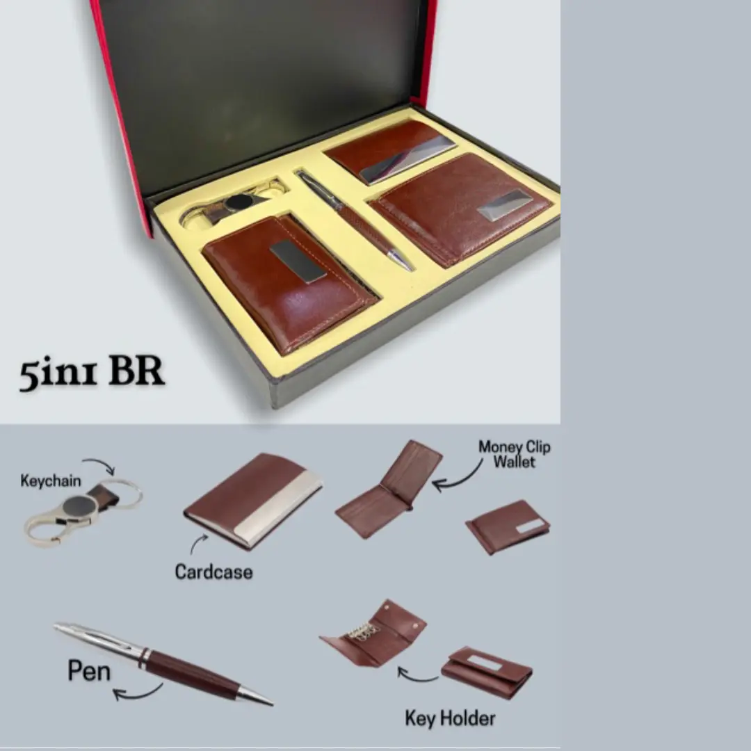 Introducing the ultimate convenience and style in the form of 5 in 1 Gift Sets. These versatile sets are designed to meet all your daily needs with elegance and functionality. Featuring a sleek keychain to keep your keys secure, a sophisticated pen for jotting down notes, a practical key holder for organization, a chic card case for easy access to your essentials, and a sleek wallet to keep your cash and cards organized. Whether for yourself or as a thoughtful gift, these sets offer unparalleled convenience and sophistication, ensuring you’re always prepared in style wherever you go.